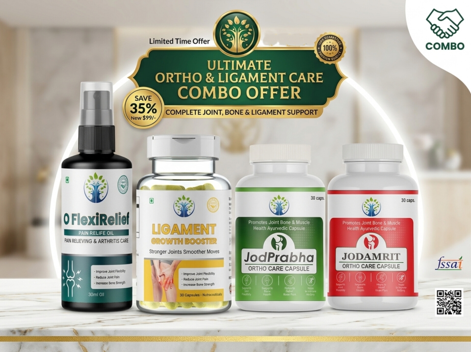 जोड़ों के दर्द से आज़ादी और बेहतर मूवमेंट के लिए संपूर्ण समाधान! हमारा ‘अल्टीमेट ऑर्थो और लिगामेंट केयर कॉम्बो’ एक ऐसा 4-इन-1 सिस्टम है, जो जोड़ों के दर्द, हड्डियों की कमजोरी और लिगामेंट की समस्याओं को जड़ से ठीक करने के लिए बनाया गया है। चाहे बढ़ती उम्र की जकड़न हो या खेल-कूद की चोट, यह कॉम्बो आपके शरीर को पूरी रिकवरी देता है।